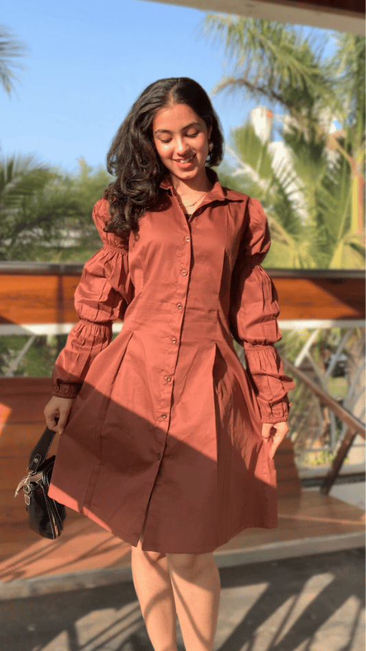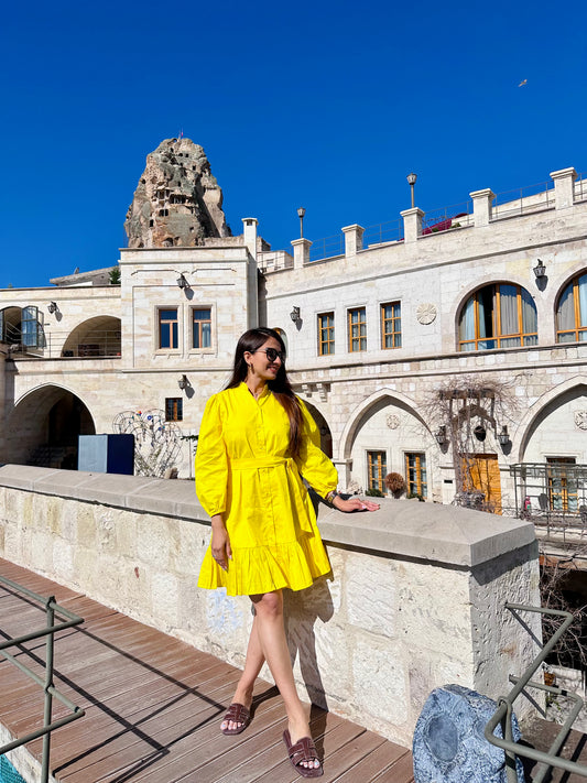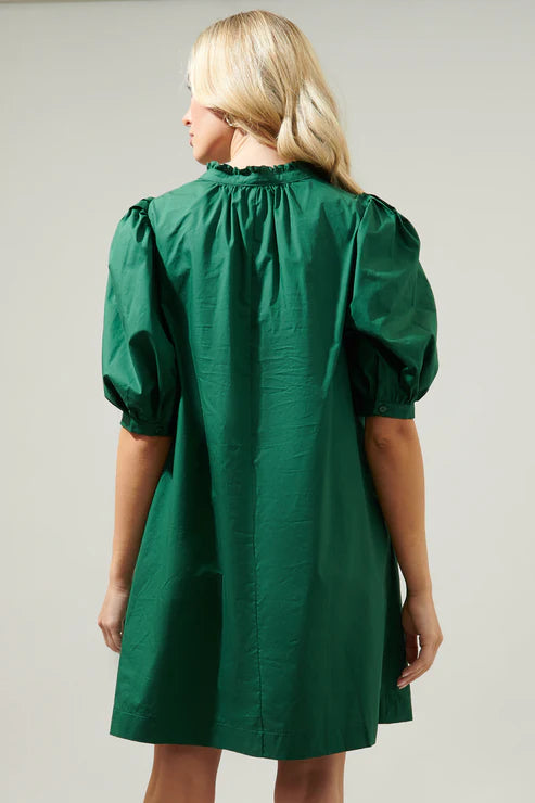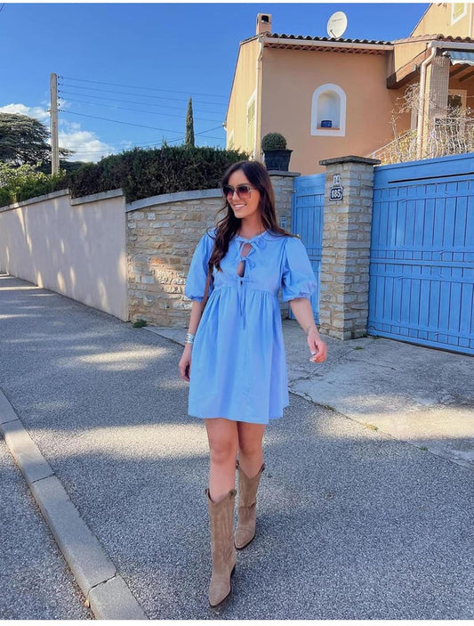 Puff Sleeve Tie-front Cotton Babydoll Dress - Blue